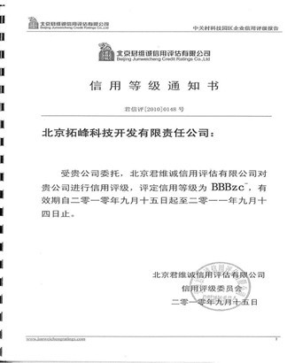 Beijing Junweicheng Credit ratings Co., Ltd is responsible for the credit assessment in the 2010 credit rating of zhong guan cun science park. It analysed our company's management system, financial situation, business running and situation of